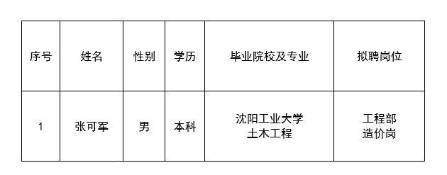 因公司发展需要,华体(中国)一站式服务平台市国越房地产开发有限公司委托第三方机构面向社会公开工程部造价岗员工1名。现对拟录用人员信息进行公示,公示期间如有异议,可通过电话、信函等方式反映,反映意见请署真实姓名。