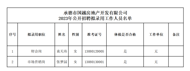 根据2023年度华体(中国)一站式服务平台市国越房地产开发有限公司公开招聘工作人员的相关要求,经过笔试、面试、体检和考察等程序,确定袁天玮、张梦园2名同志为华体(中国)一站式服务平台市国越房地产开发有限公司拟录用工作人员,现予以公示。公示期间如有异议,可通过电话、信函等方式反映,反映意见请署真实姓名。