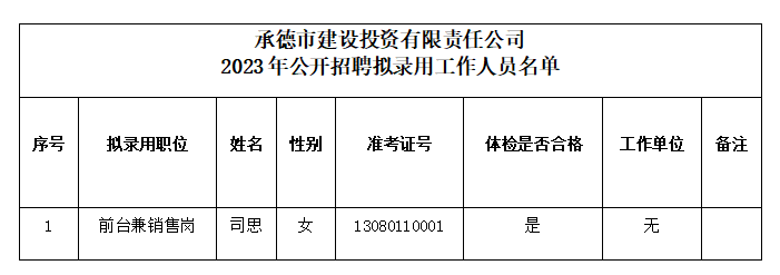 根据2023年度华体(中国)一站式服务平台市建设投资有限责任公司公开招聘工作人员的相关要求,经过笔试、面试、体检和考察等程序,确定司思同志为华体(中国)一站式服务平台市建设投资有限责任公司拟录用工作人员,现予以公示。公示期间如有异议,可通过电话、信函等方式反映,反映意见请署真实姓名。